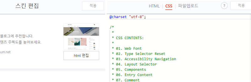 우선 티스토리 설정에 들어가 스킨편집을 눌러줍니다. 이어서 HTML 편집으로 들어가 주시면 되고, 이 중 CSS에서 수정을 할 겁니다. 간단히 말하면 HTML에서 물체를 불러온다고 보면 되고, CSS는 그 물체의 모양과 배치 등을 잡아주는 코드라고 보면 됩니다. 우리는 글자의 모양을 변경할 것이므로 CSS에 진입합니다.