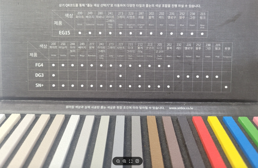 추가로 줄눈의 경우 인테리어 업체와 상의하여 미리 색을 정해주는 게 좋은데요. 요즘에는 독일 아덱스 사의 줄눈을 많이 사용하는데 아래 이미지와 같은 견본을 인테리어 사장님이 하나씩은 가지고 계실 겁니다. 타일을 고르고 나서 견본의 색을 하나씩 대 보며 최대한 타일 색과 비슷한 색감의 줄눈을 선택하는 게 베스트 옵션입니다.